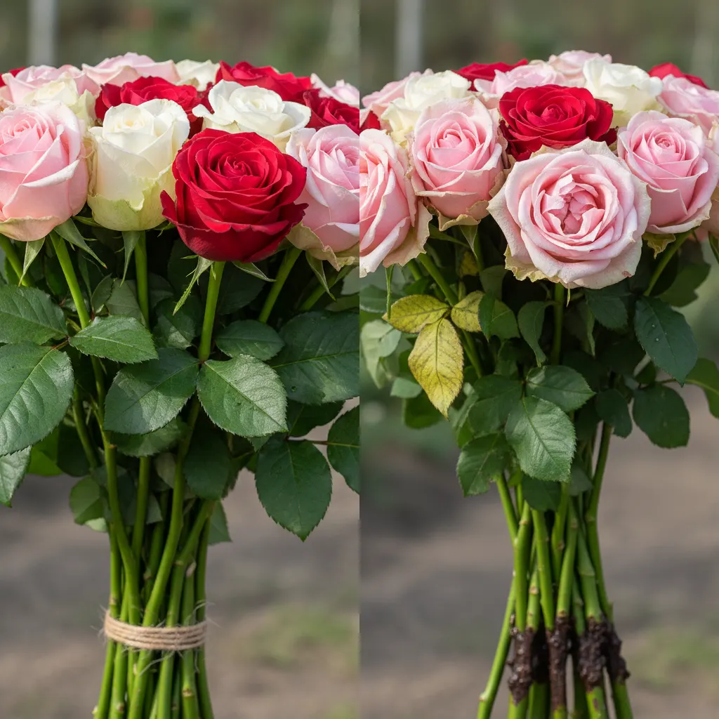 - La Prueba Definitiva: La Base del Tallo. Si está oscura, seca, blanda o huele raro, esa rosa lleva demasiado tiempo sin agua. No la cojas ni aunque te la regalen.