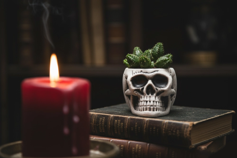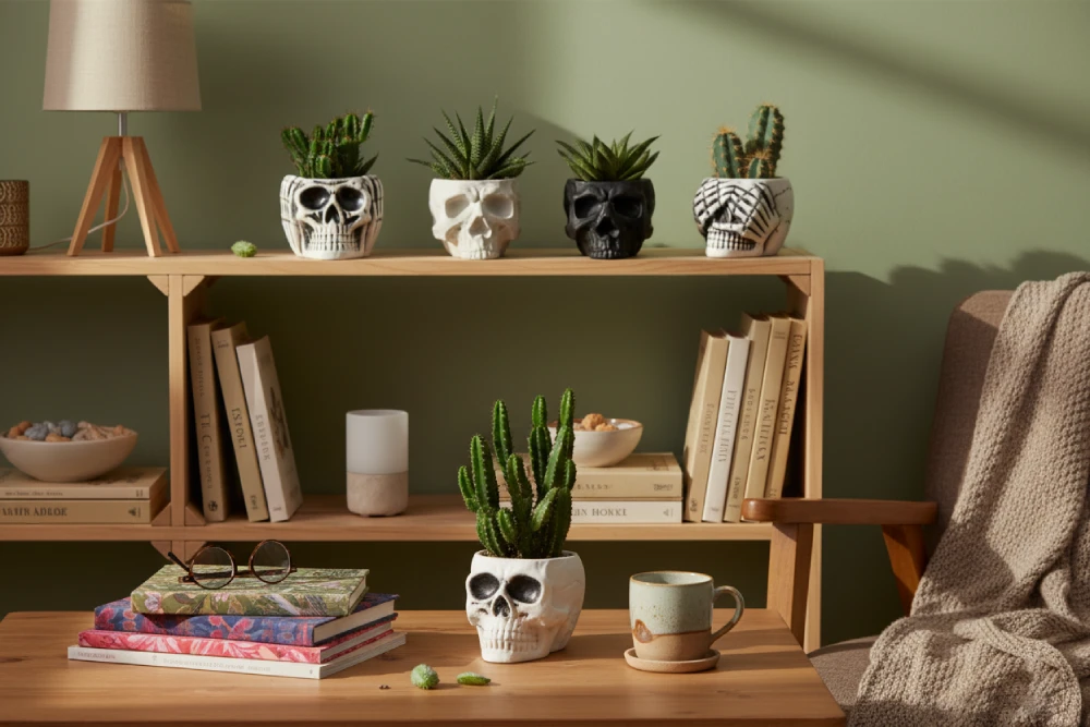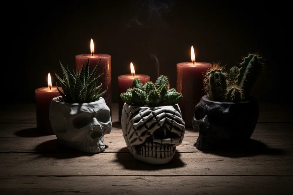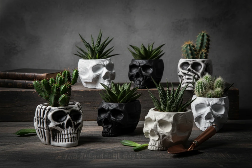 Conjunto de macetas en forma de calavera con cactus o suculenta incluida, listas para decorar sin complicaciones.